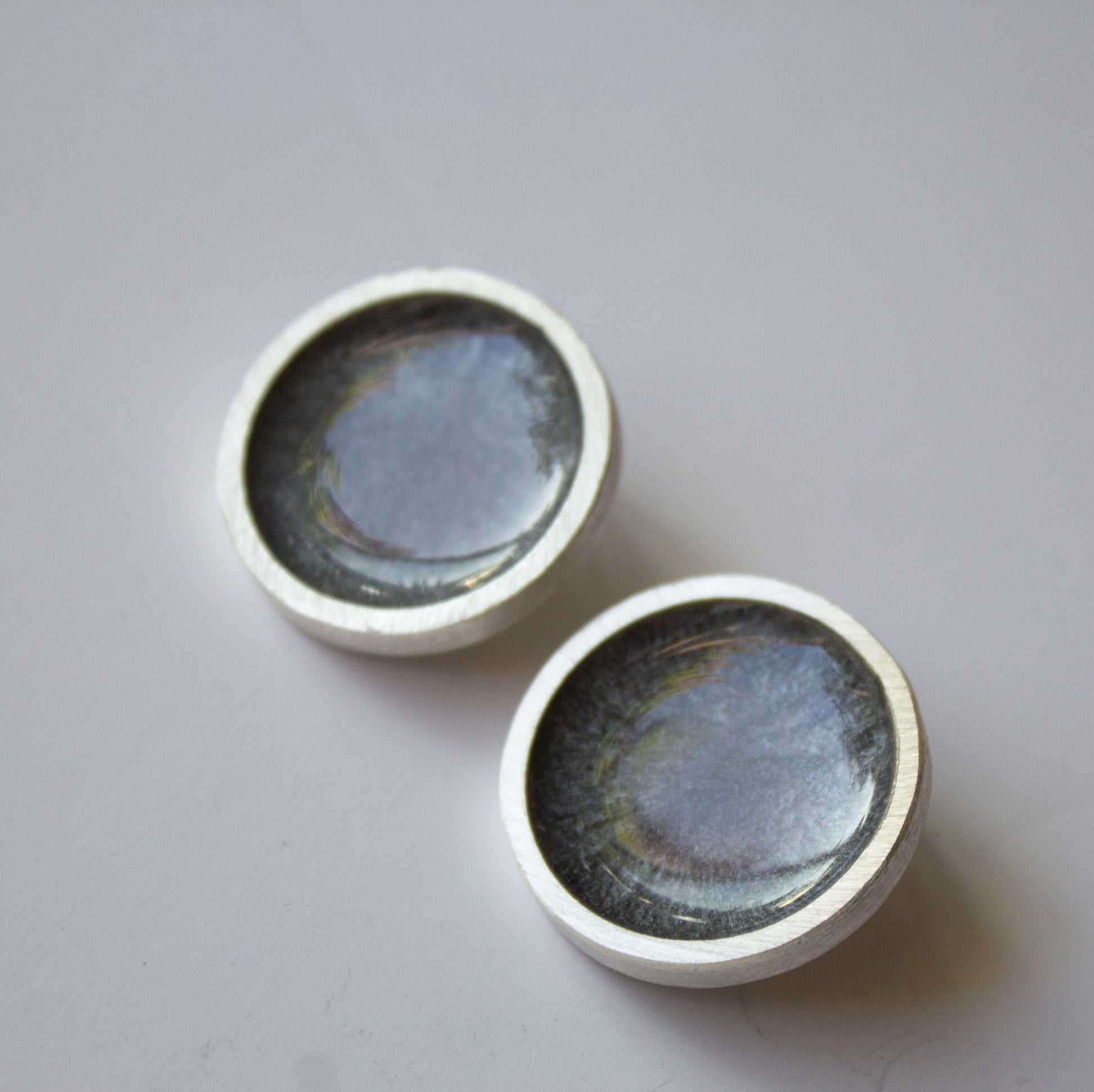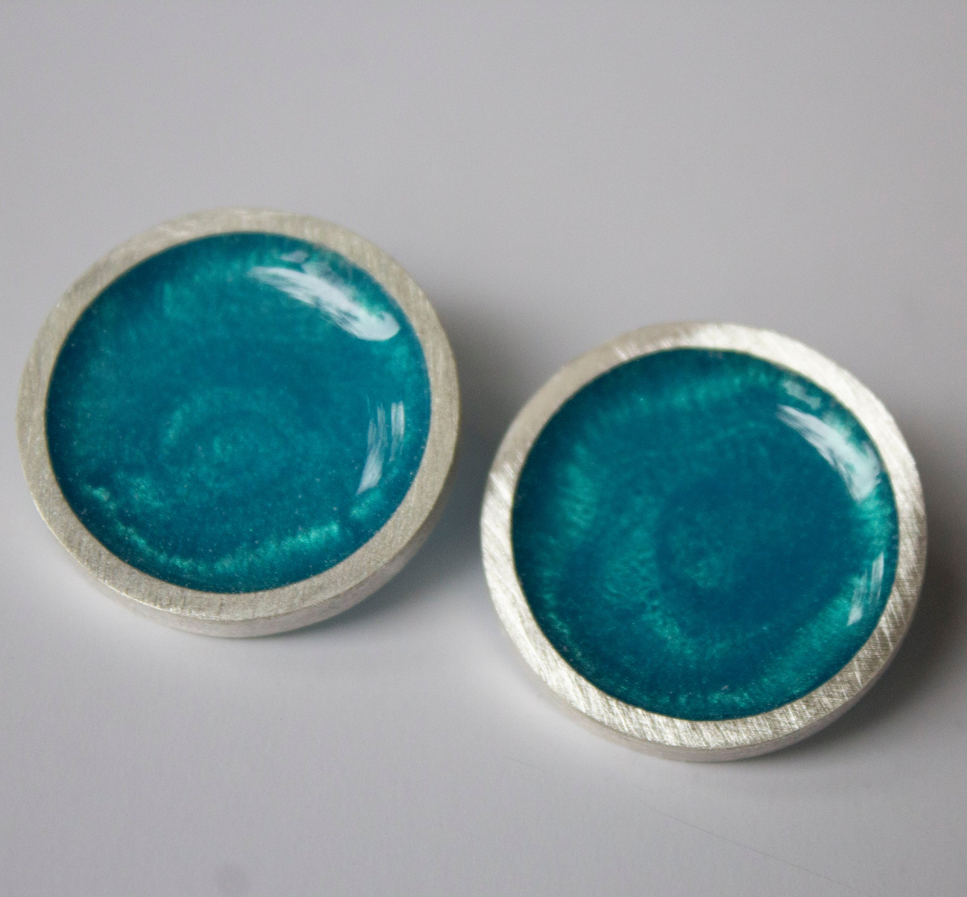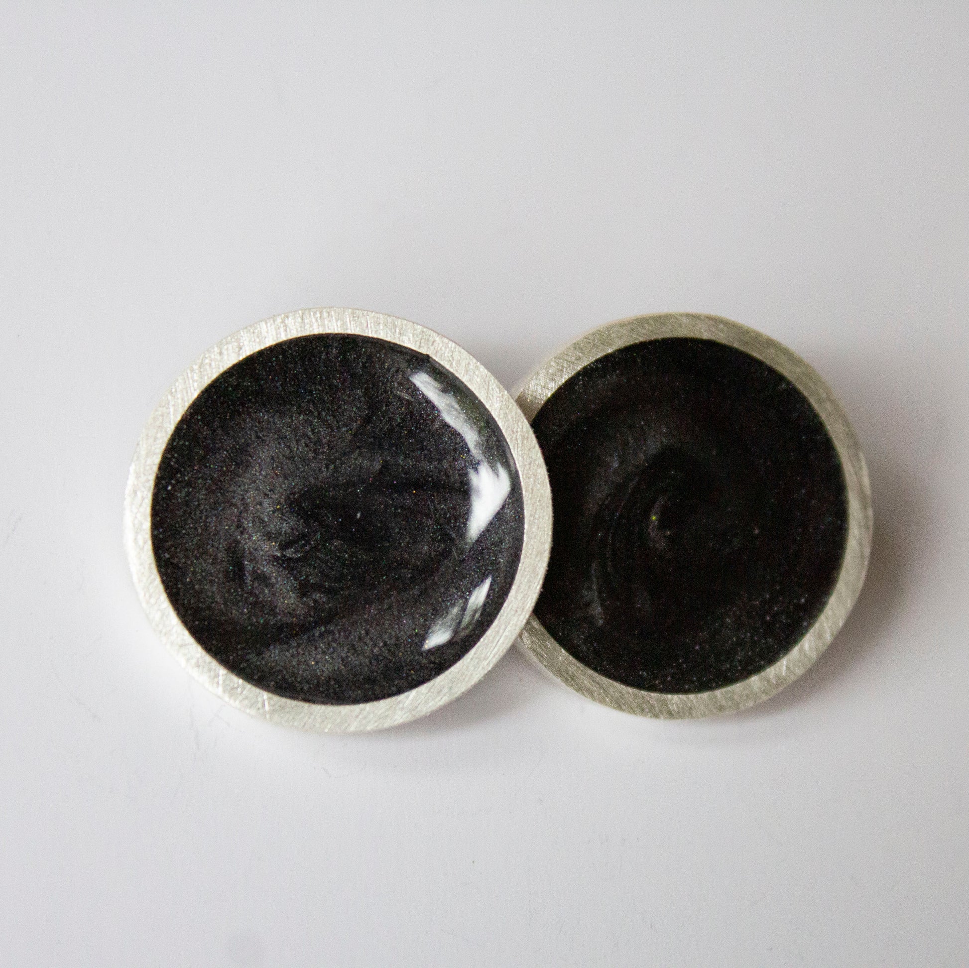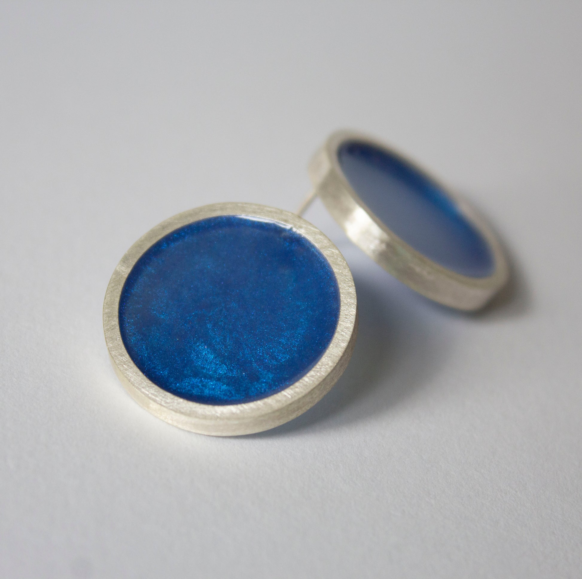Coloured and shimmering resin now in a choice of 19 colours (matte or gloss) framed in a sterling silver circle frame. These earrings are approx 2.4 cms in diameter. The ear post is made of sterling silver too.