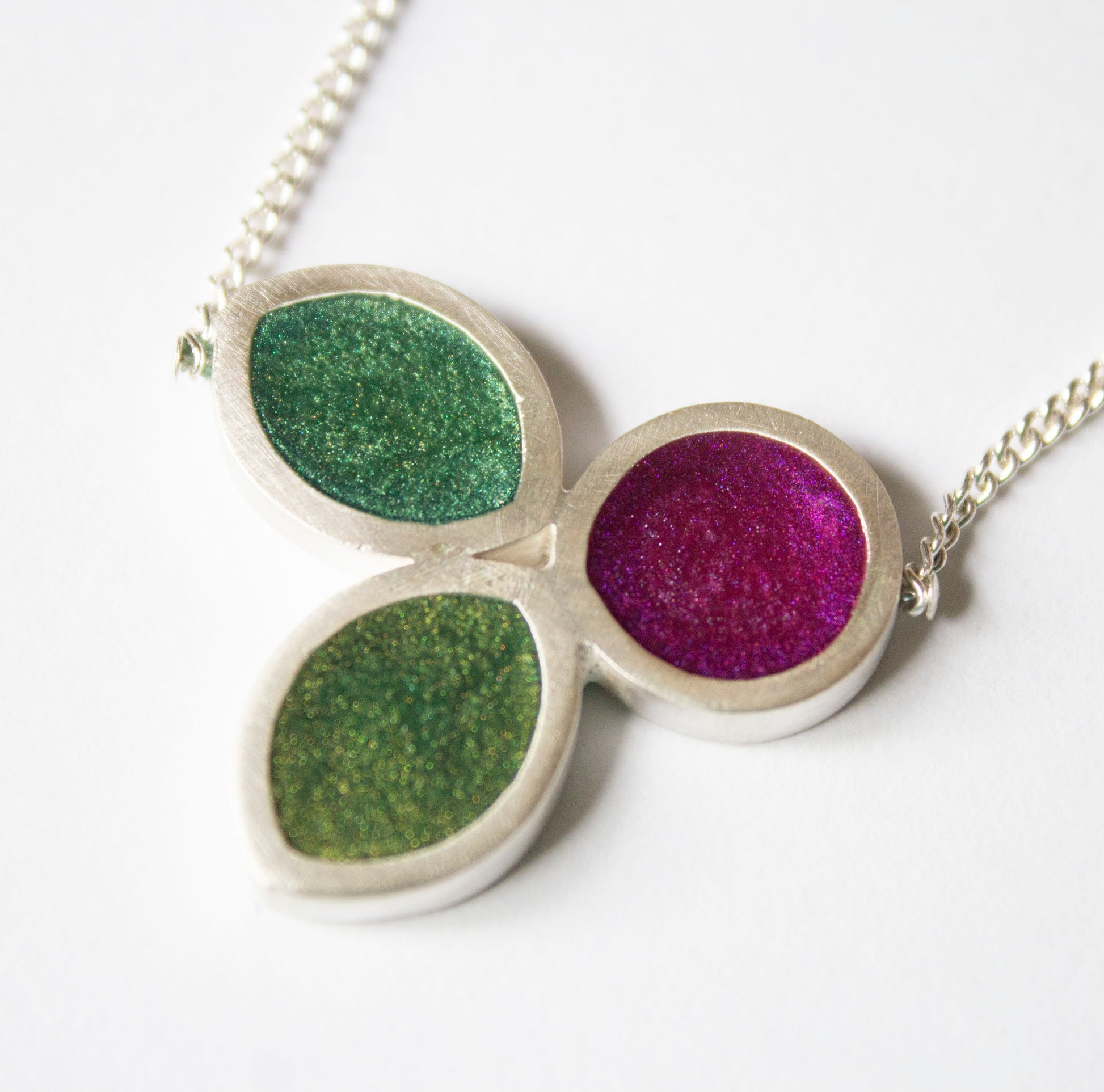 Each leaf is 1 cms wide and 1.6 cms long and are made from 100% recycled sterling silver with a silver back. The circle is approximately 1.3 cms in diameter and is a deep cerise. I have a total of 22 colours in my collection so please let me know which colours you would like!