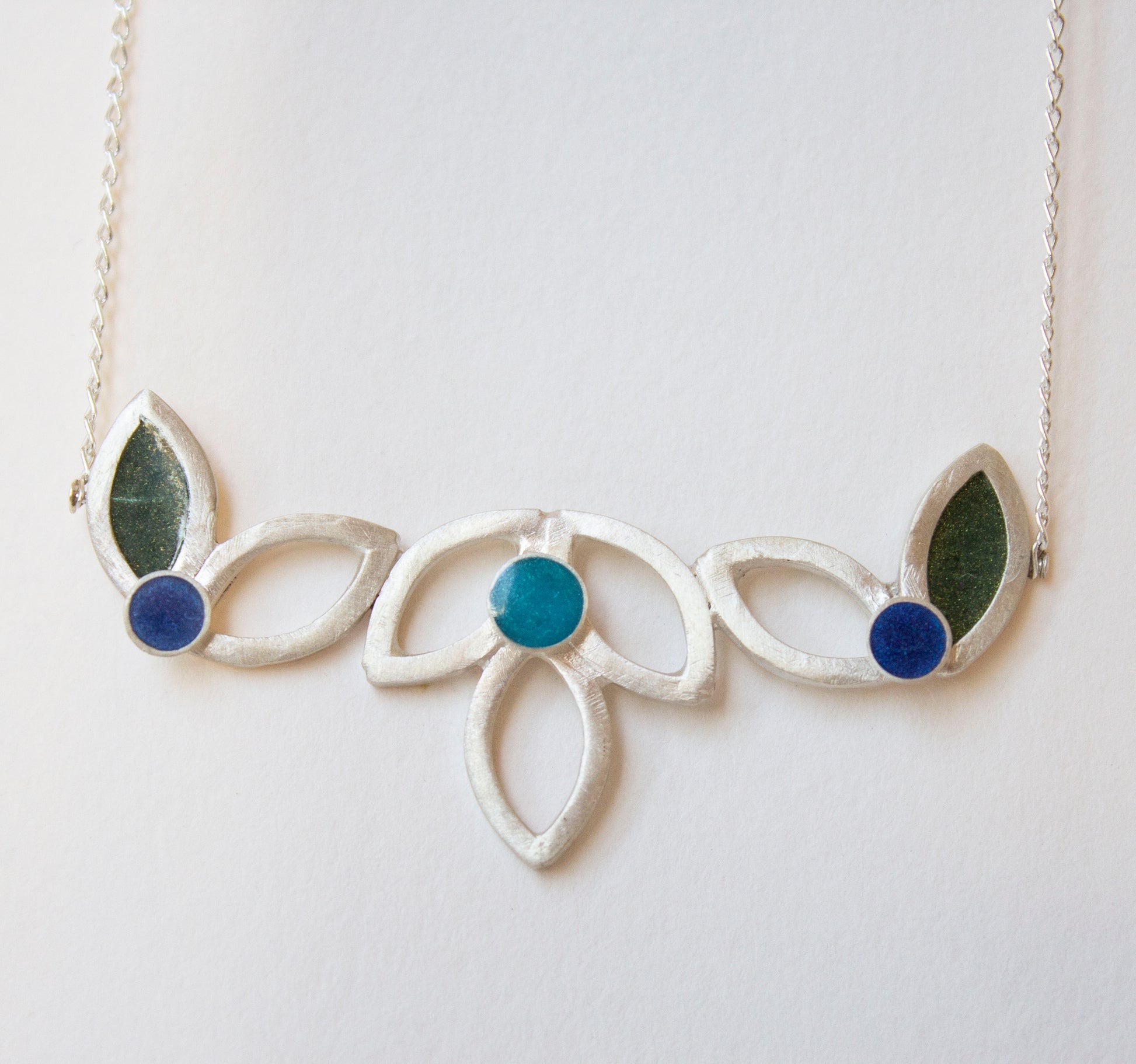 It is made from shallow square sterling silver leaves and domes. Some of the leaves are filled with resin as are the domes. Some of the leaves are unfilled so creating a light lace like effect.