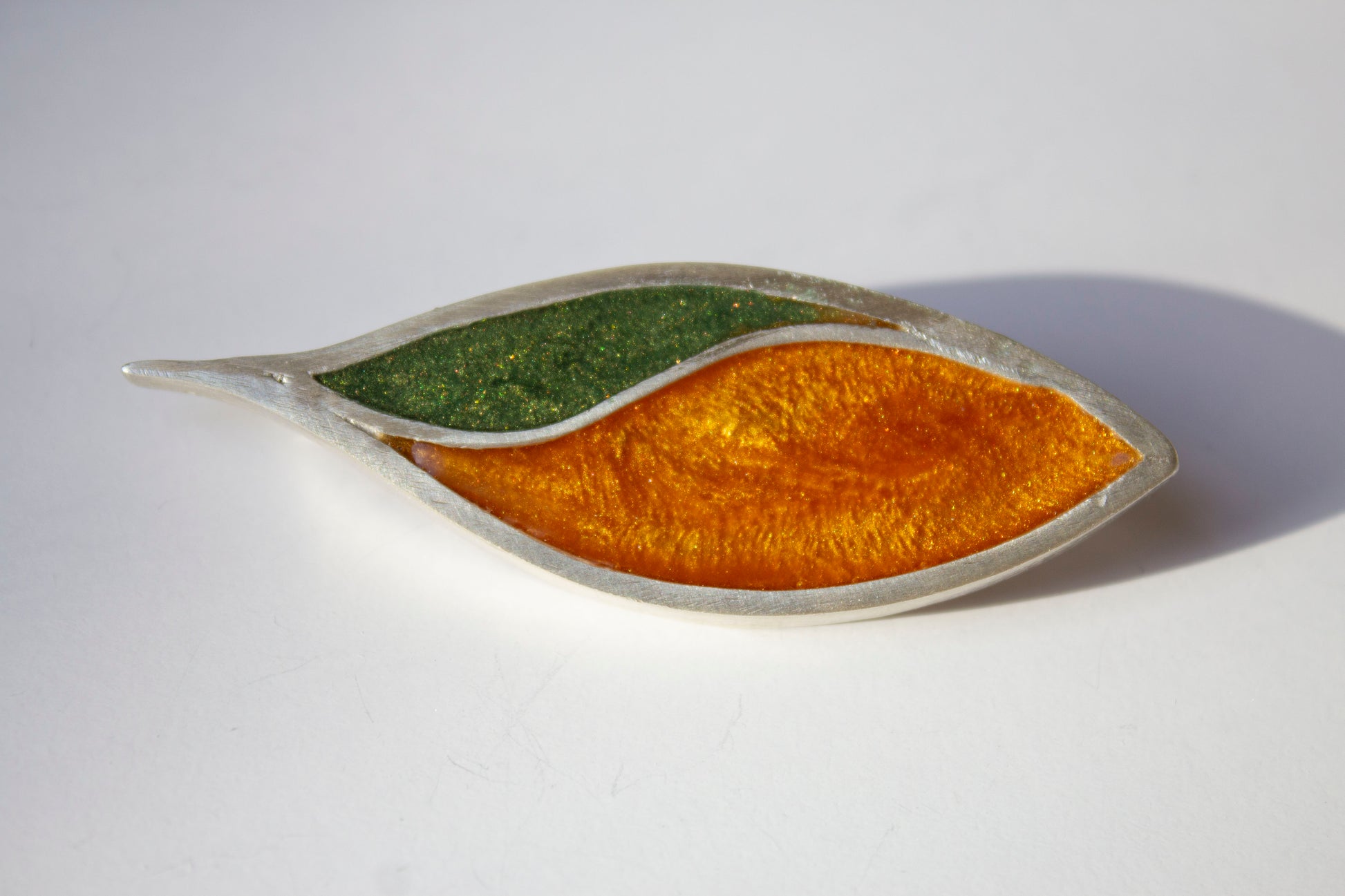 This piece is made of recycled sterling silver. It is decorated with glossy dark gold and olive green resin but can be any colours of your choice.