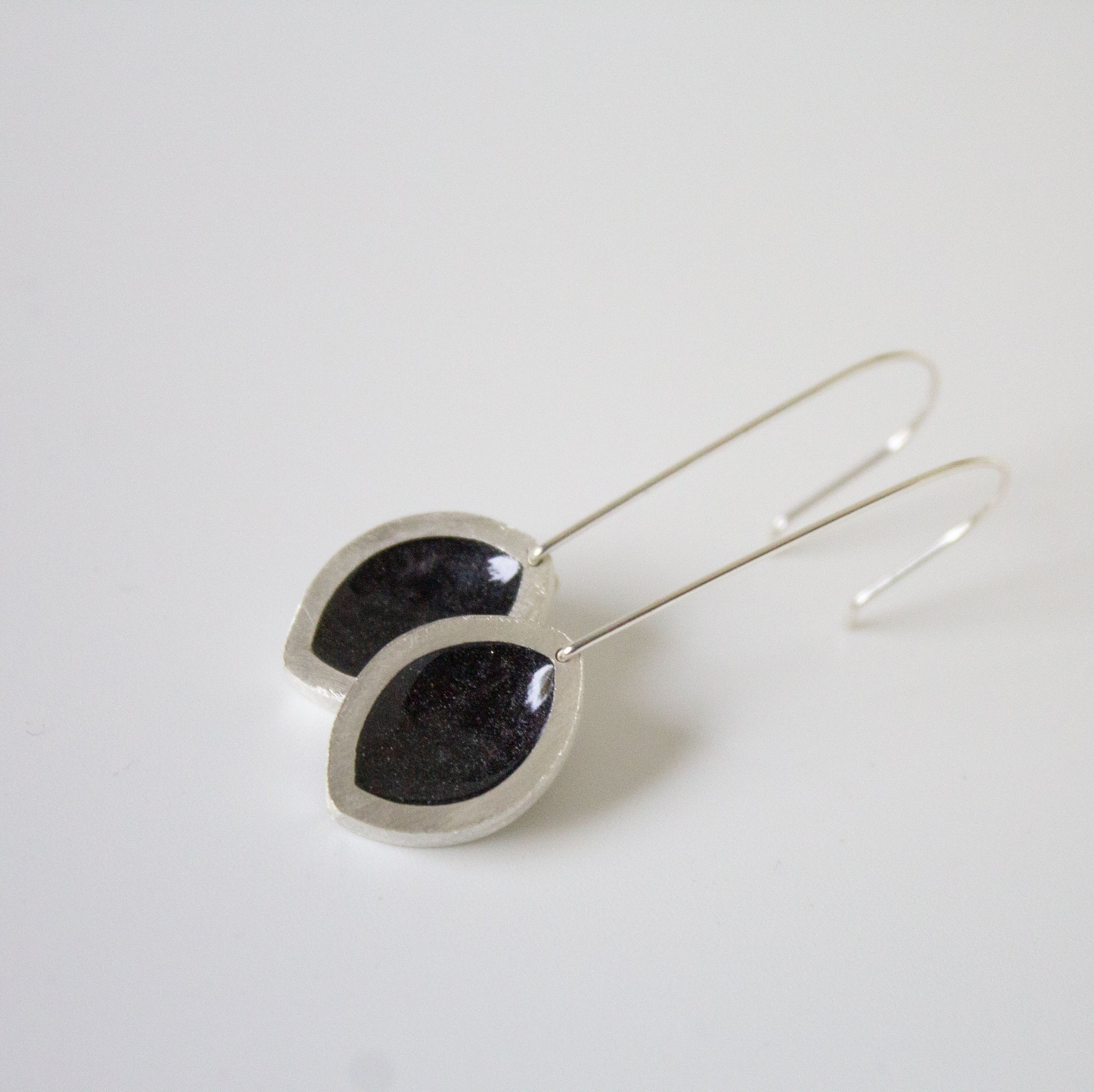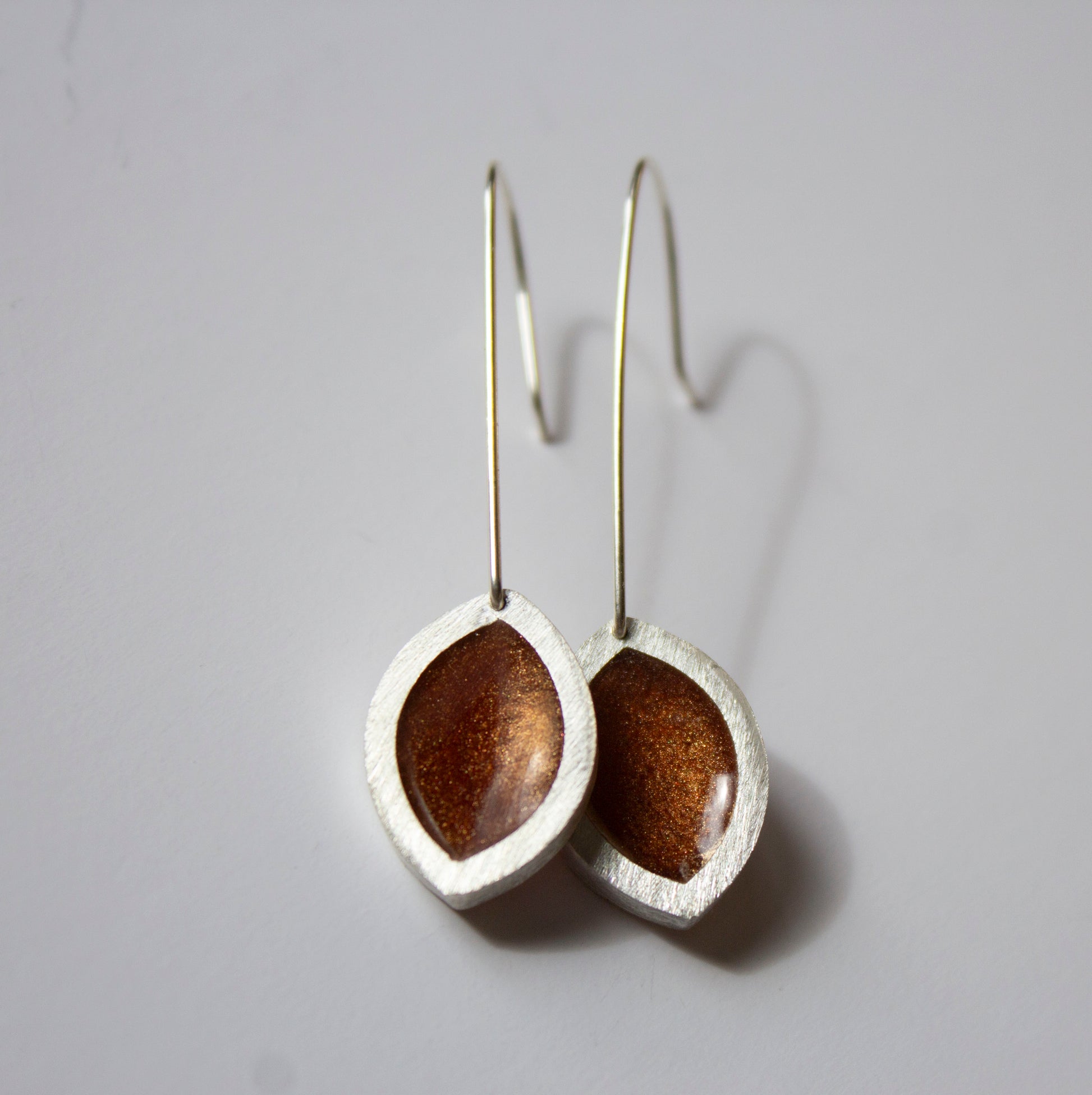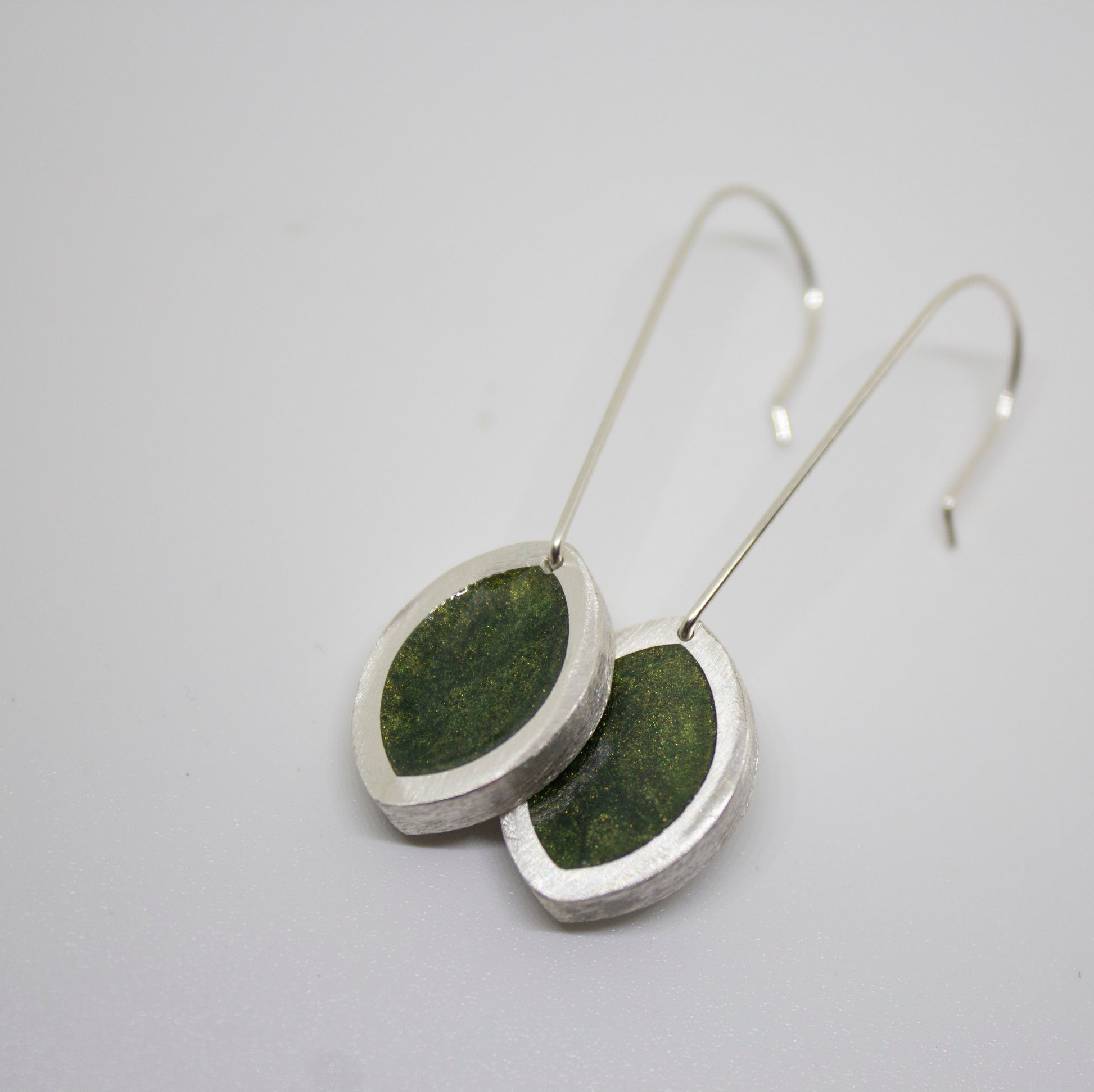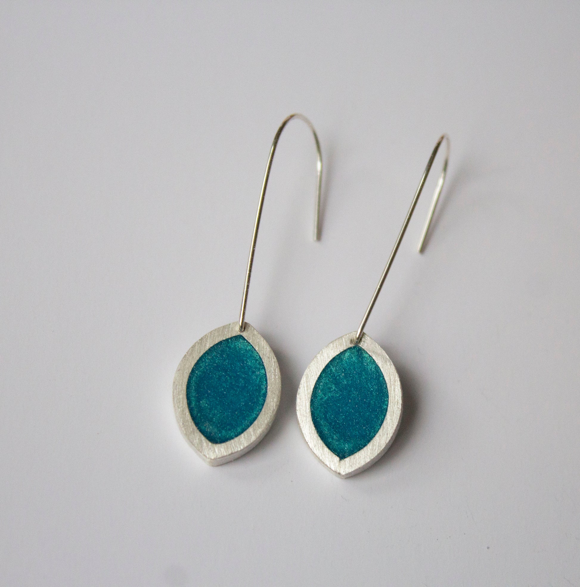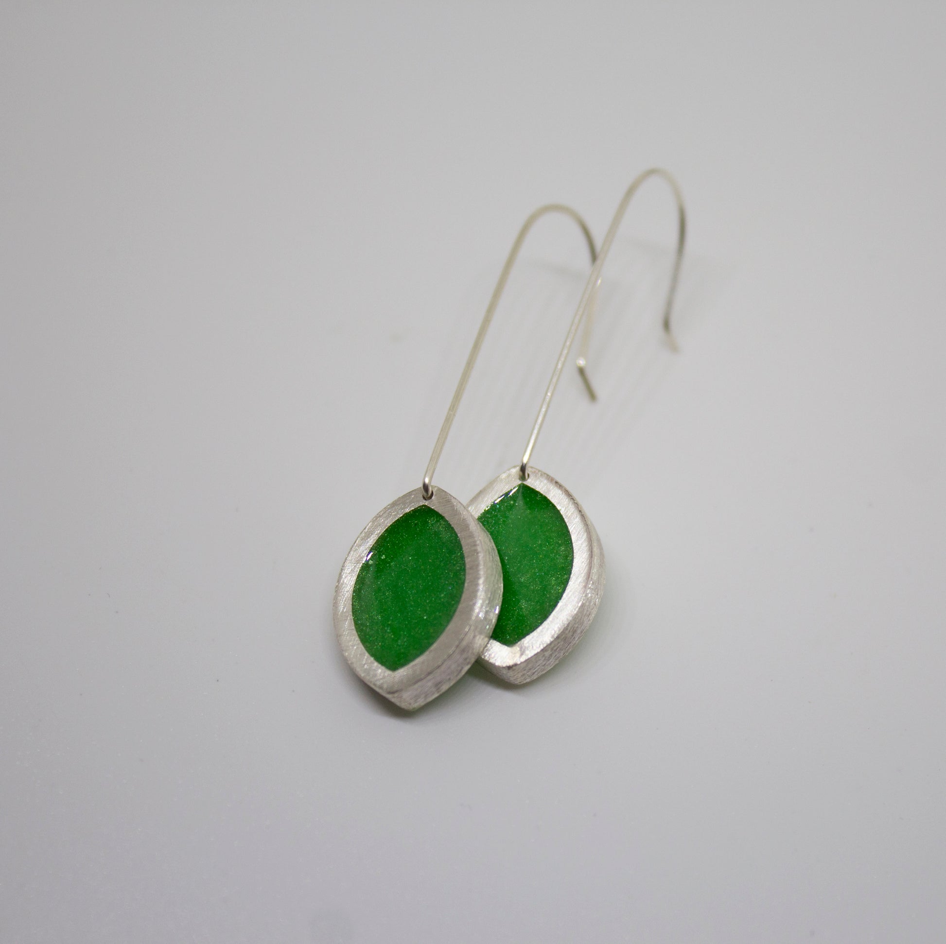Coloured and shimmering resin now in a choice of 19 colours framed in a sterling silver leaf frame. These earrings are approx 1 cm wide and the total length of the earring is approximately 4 cms. The ear wire is made of sterling silver too.