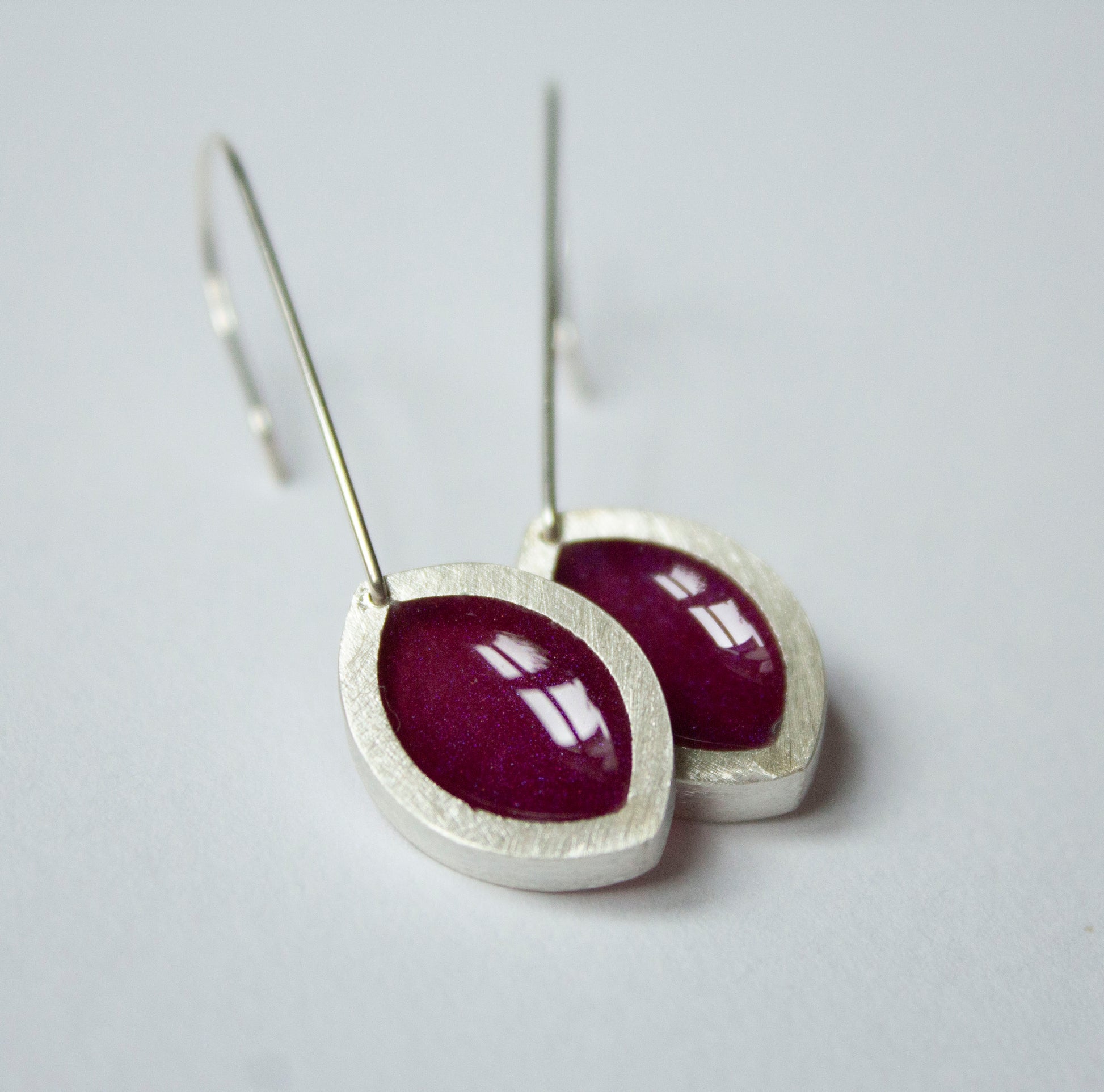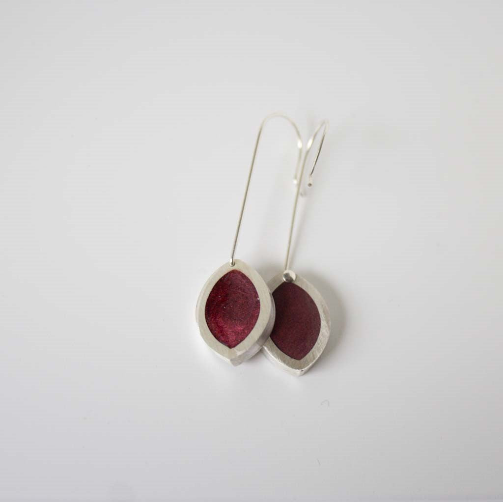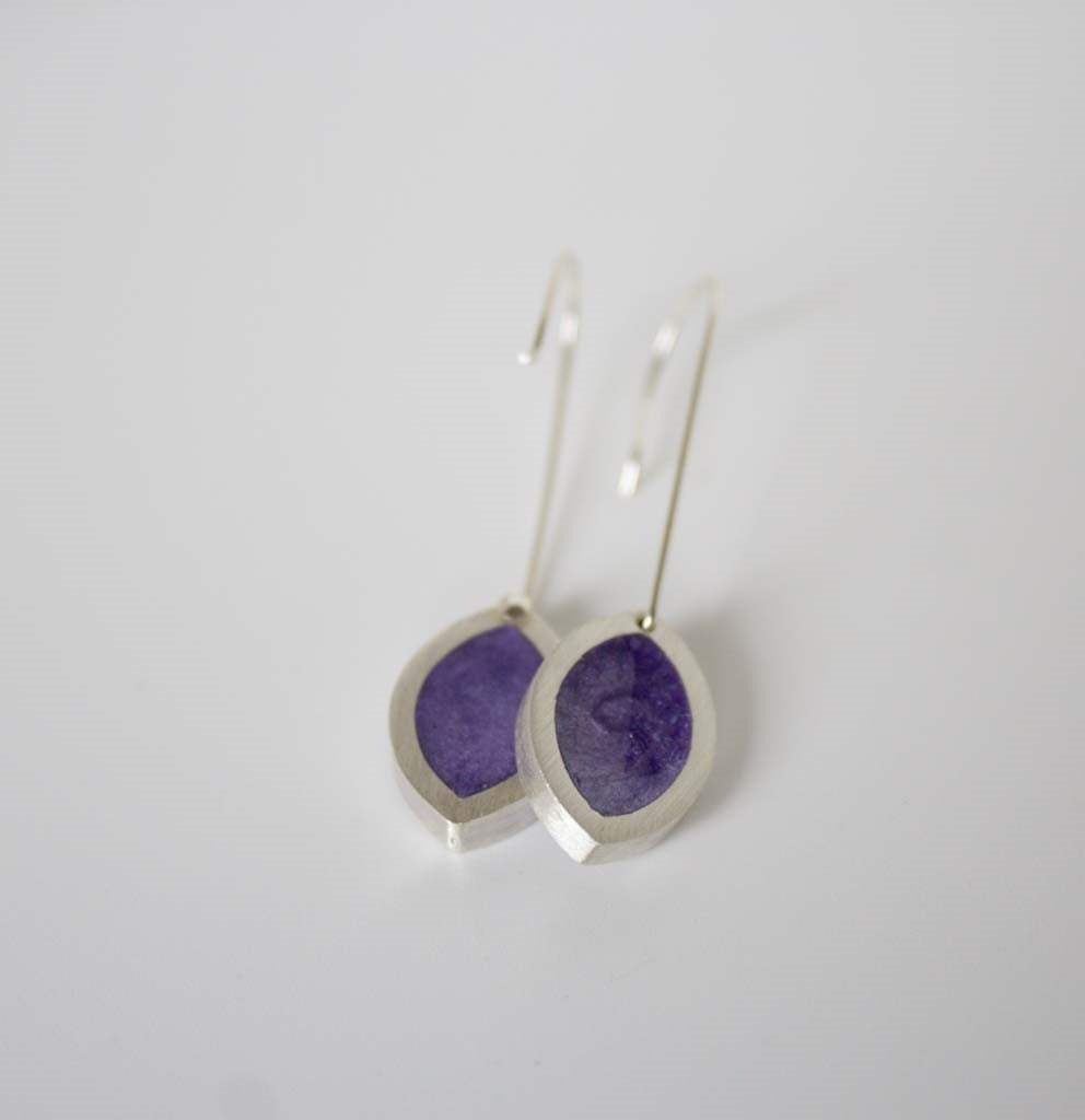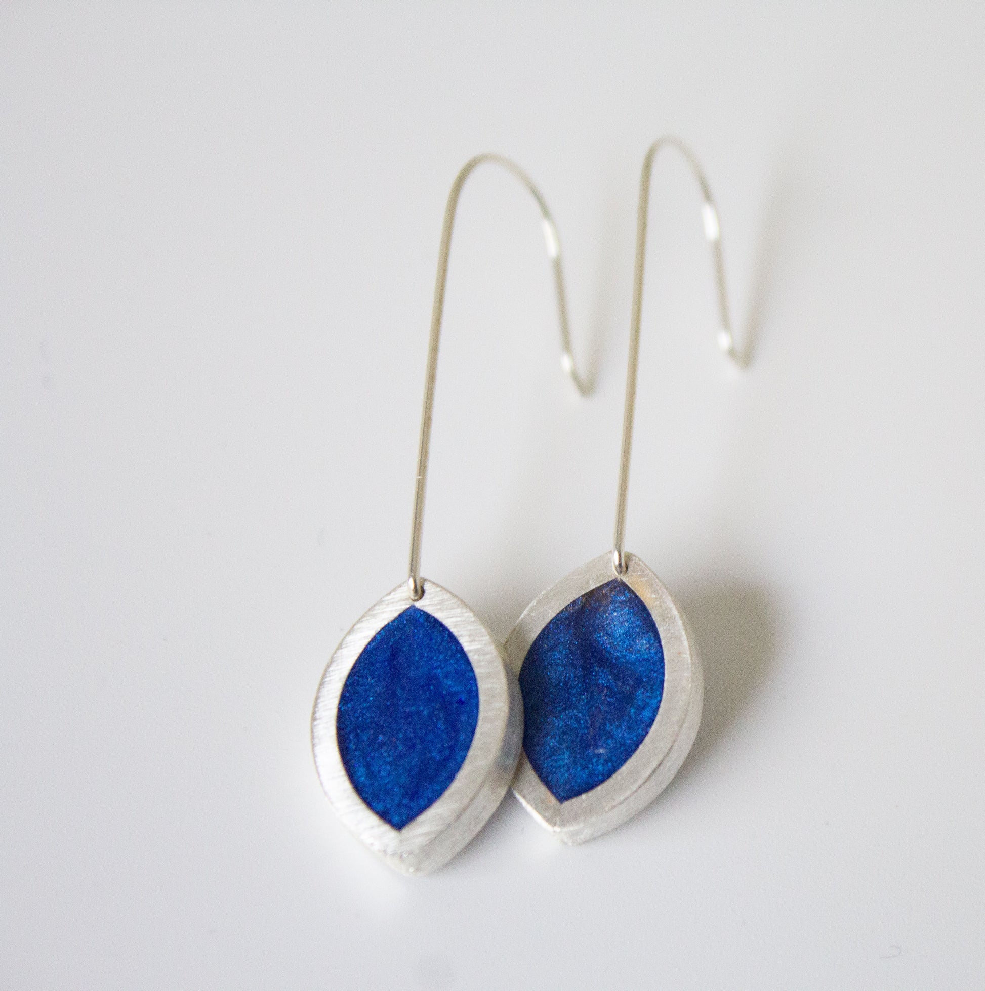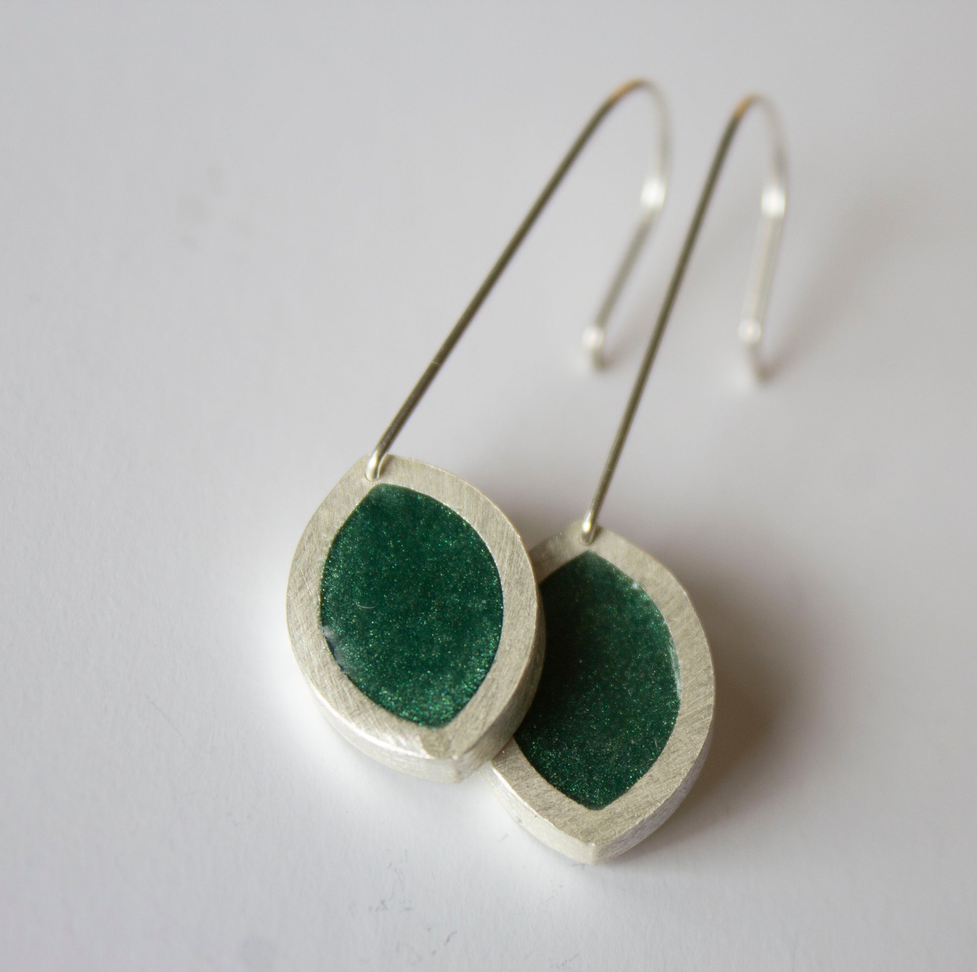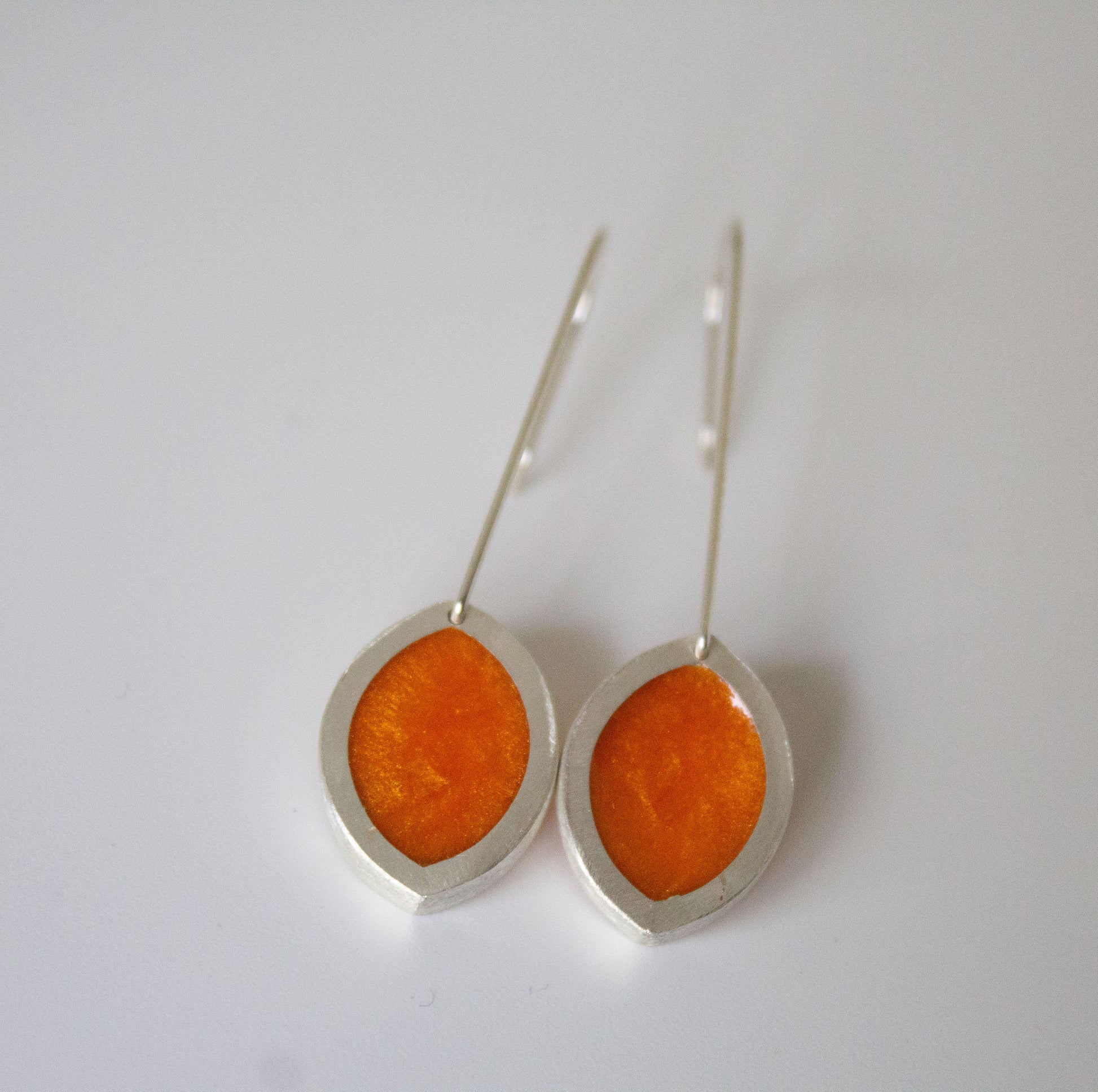 Coloured and shimmering resin now in a choice of 19 colours framed in a sterling silver leaf frame. These earrings are approx 1 cm wide and the total length of the earring is approximately 4 cms. The ear wire is made of sterling silver too.