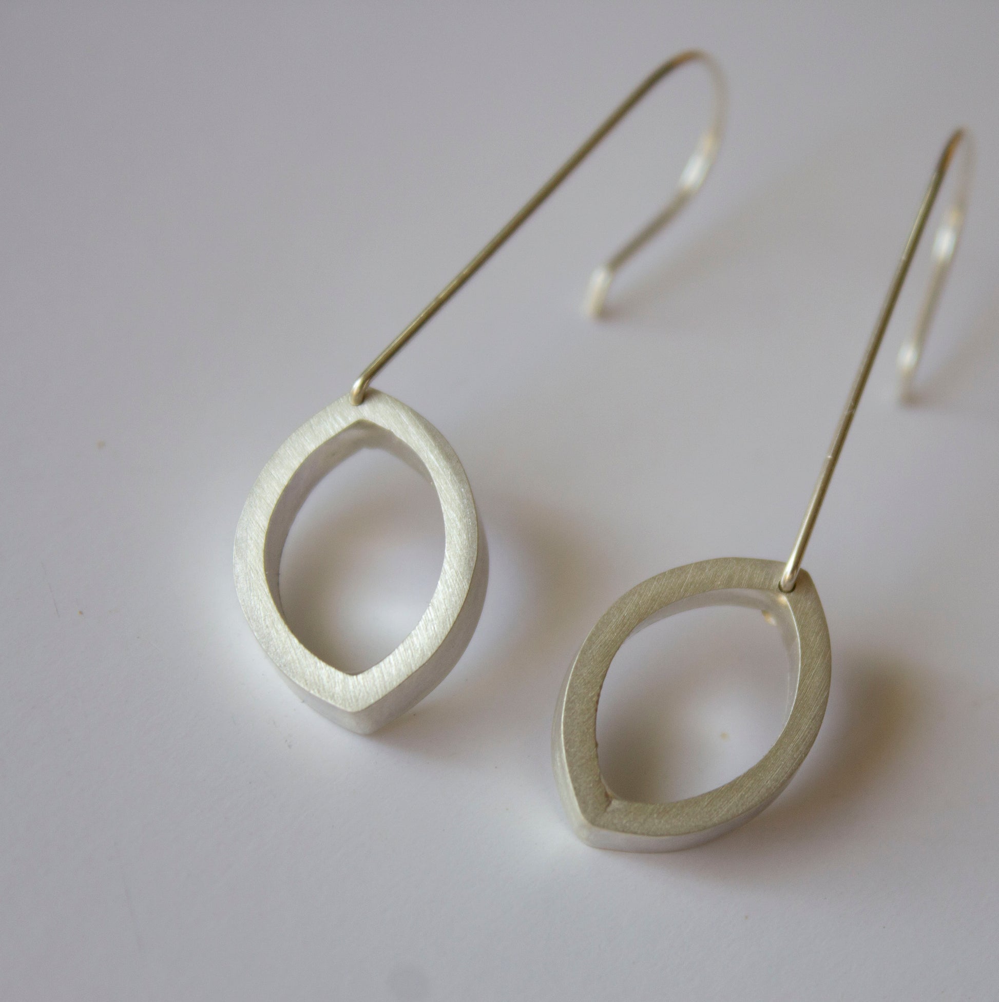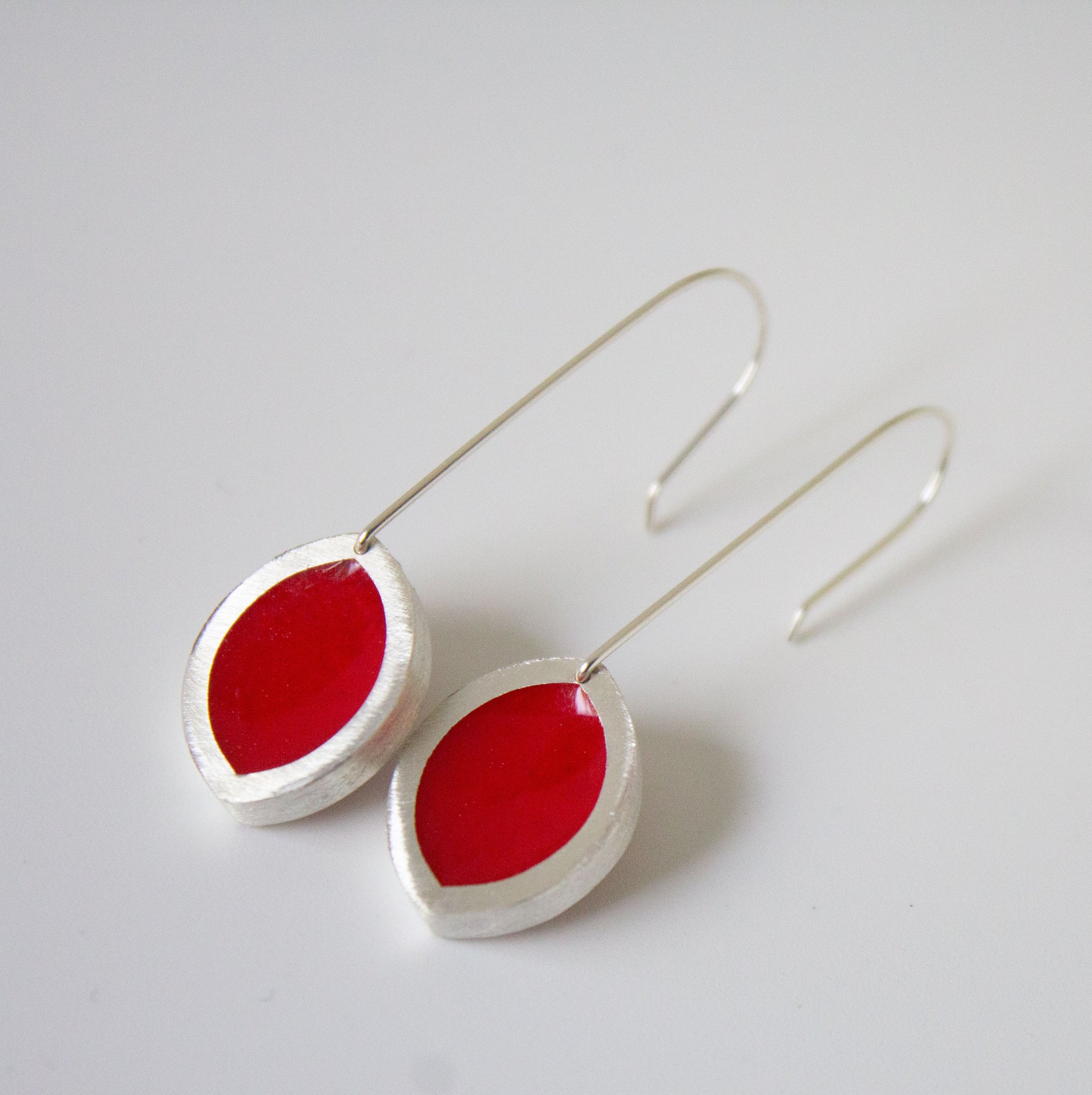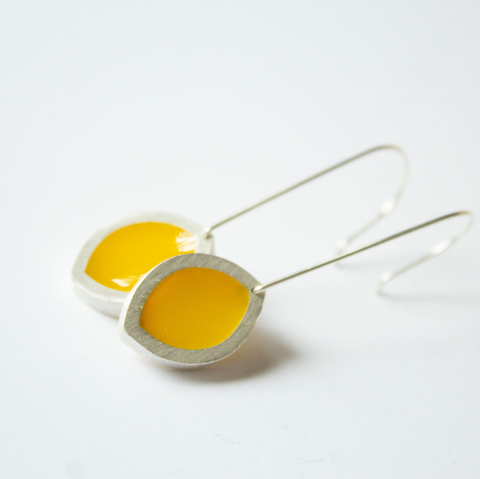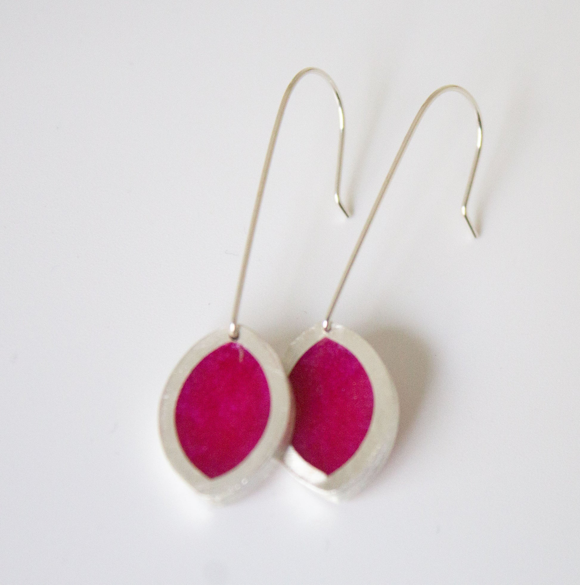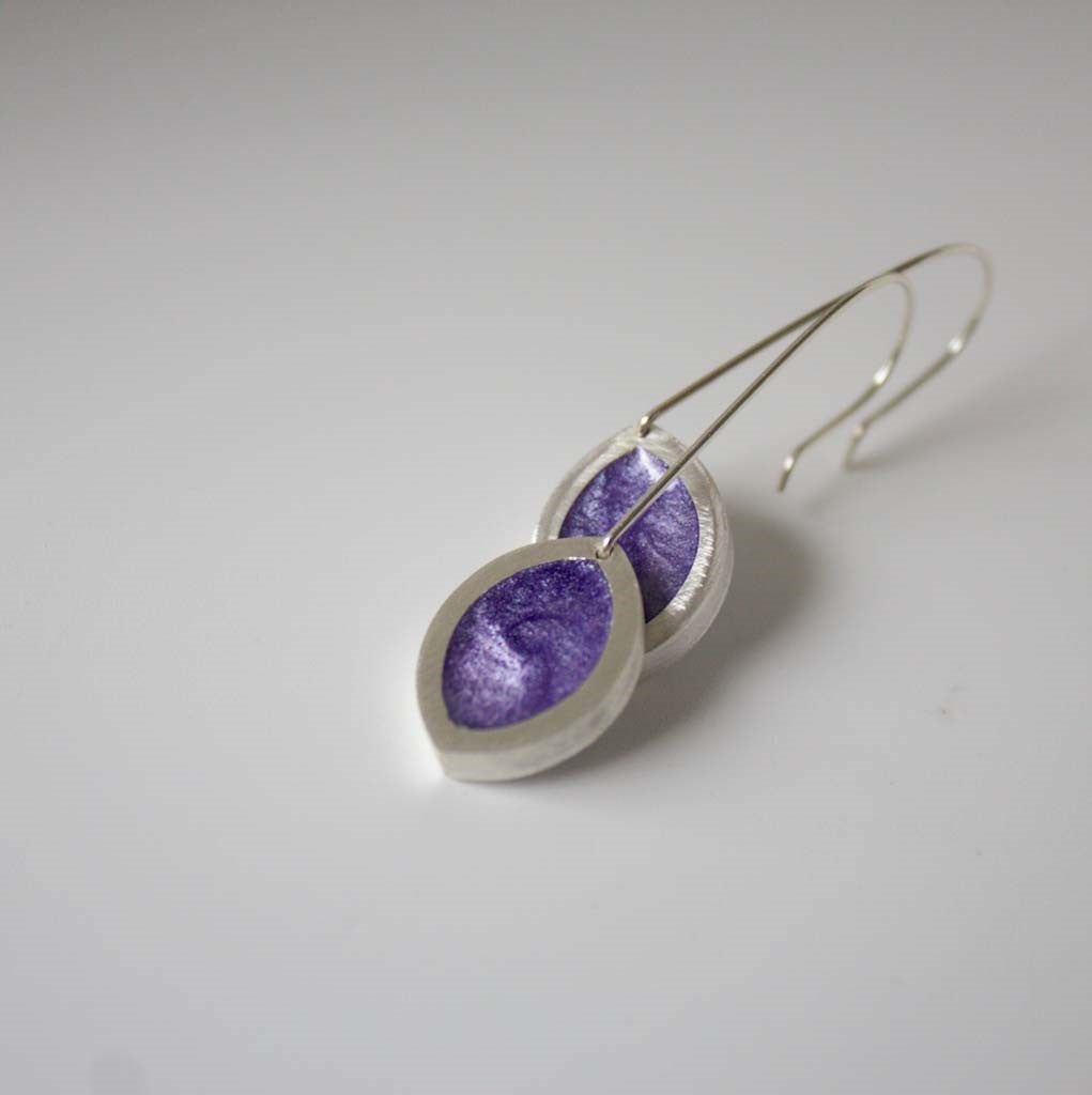 Coloured and shimmering resin now in a choice of 19 colours framed in a sterling silver leaf frame. These earrings are approx 1 cm wide and the total length of the earring is approximately 4 cms. The ear wire is made of sterling silver too.
