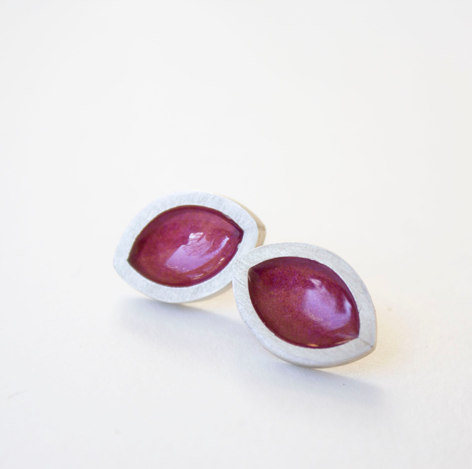Stud earrings of 100% recycled sterling silver, filled with a choice of 18 colours. Leaf length is 1.6 cms and they are 1 cm wide.