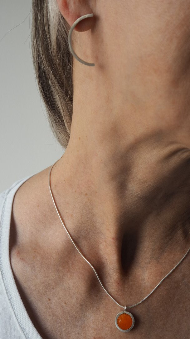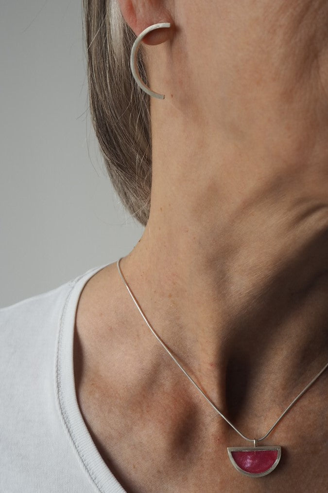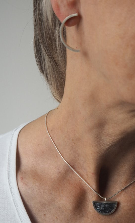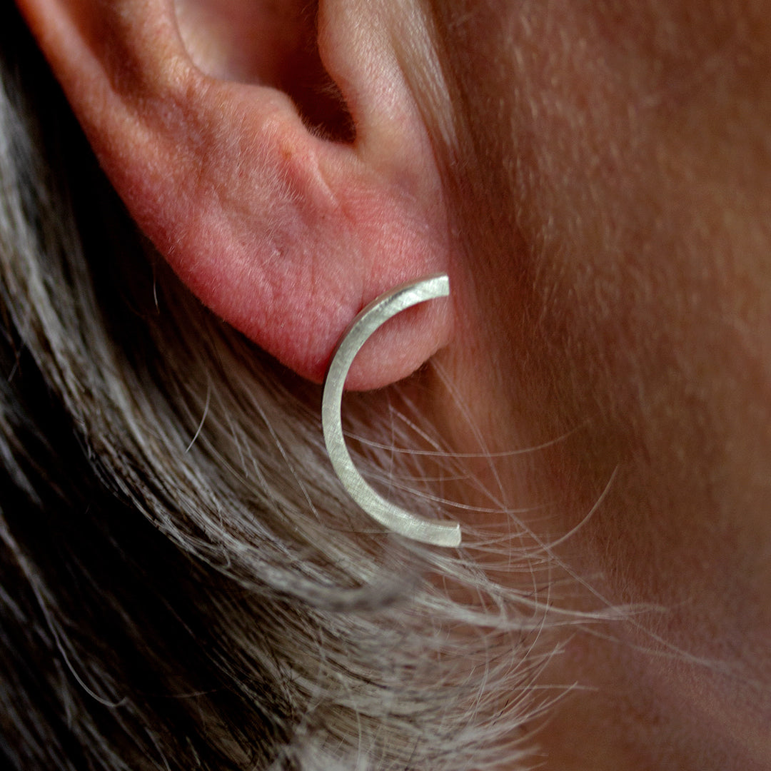 The silver arcs are available in 3 sizes and as an asymmetric pair too. They are simple to wear, a striking and elegant design made of 100% recycled sterling silver. The arcs are 3cms long and the silver is 0.2 cms wide. They have a 'brushed' semi-matte finish.