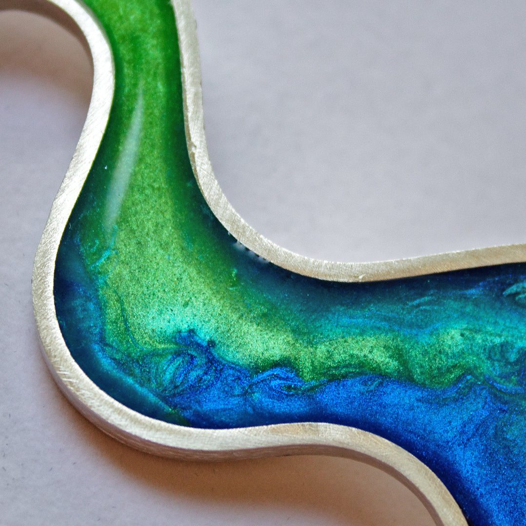 This piece is made from recycled sterling silver. It measures approximately 7.5cms in length and is 3cms wide (at its widest part) and is fitted with a silver pin and safety catch.